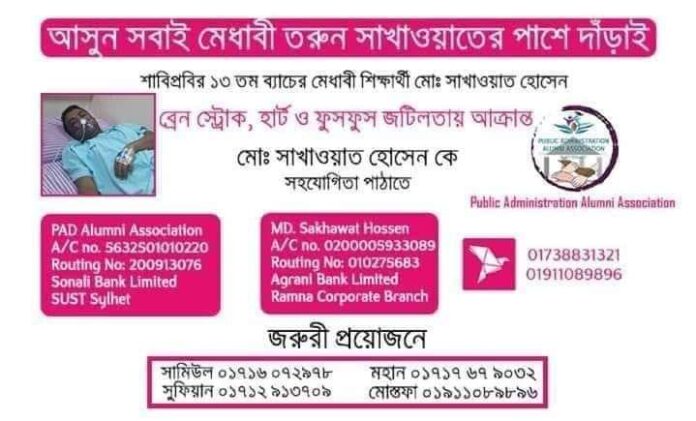 শাহজালাল বিজ্ঞান ও প্রযুক্তি বিশ্ববিদ্যালয়ের ১৩ তম ব্যাচ (পিএসএ বিভাগের ৮ম ব্যাচ ও লোকপ্রশাসন বিভাগের মাস্টার্স ৪র্থ ব্যাচ) এর শিক্ষার্থী সাখাওয়াত হোসেন রাসেল দীর্ঘদিন ধরে ব্রেন স্ট্রোক, হার্ট এবং ফুসফুস জনিত জটিলতায় ভুগছেন।