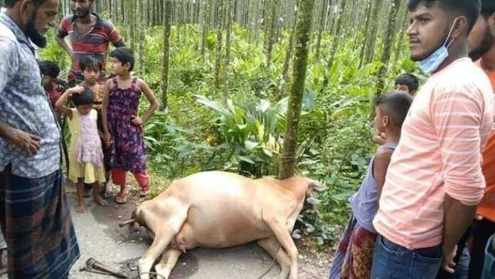 সেটি বাগানের পাশে গলায় ফাঁস লাগানো (পায়ুপথে লাঠি ঢোকানো ) অবস্থায় গরুটিকে মারা হয়।